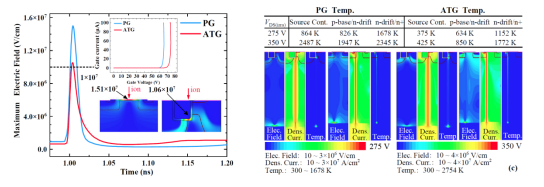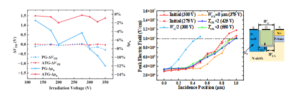 辐照前后阈值电压和沟道电子迁移率变化量(左)及ATGSiC MOSFET的加固方案和仿真结果(右)