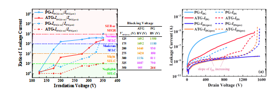 两种SiC MOSFET的单粒子辐照耐受能力(左)及辐照前后的阻断I-V(右)