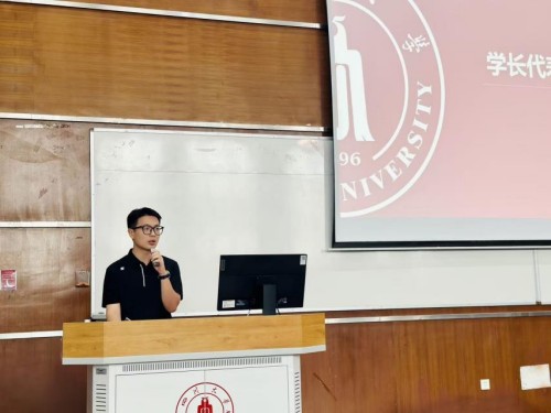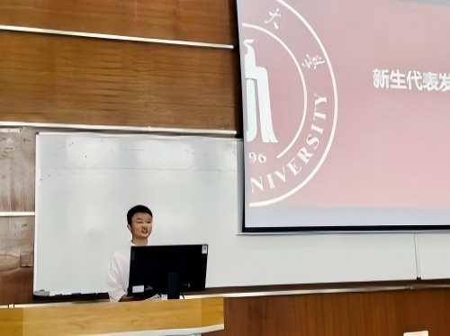 2022级核工程与核技术专业的马博垚作为学长代表上台发言,他分享了自己在学院的学习和生活经验,建议大家积极融入大学生活,充分利用学校和学院提供的各种资源,发掘自己的潜力,实现自我价值。同时,马博垚也表达了对学弟学妹们的美好祝愿,希望他们在大学四年里收获知识、友谊和成长。