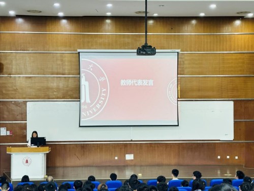 教师代表宾倩在发言中分享了自己的科研和教学经历,以亲身经历鼓励同学们在学习物理的道路上保持好奇心和求知欲。她表示,物理学是一门充满魅力和挑战的学科,需要同学们具备坚韧不拔的毅力和勇于创新的精神。在大学期间,同学们要学会自主学习,善于思考,积极与老师和同学交流合作,不断拓展自己的视野和思维方式。同时,学院全体教师将全力为同学们的成长成才提供支持和帮助,与同学们共同探索物理世界的奥秘。