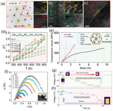 图3.多相纳米共格界面网络提升p型GeTe热电性能以及在激光非辐射能量采集和非接触式热感应中的应用。