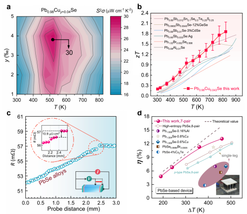 图1.铜掺杂提升n型PbSe热电性能及其高效发电能力。