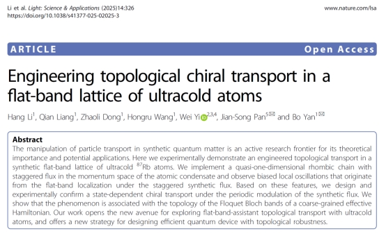 近日,9428cn太阳集团古天乐潘建松研究员与浙江大学、中国科学技术大学等单位的合作者在Nature出版集团旗下顶级光学期刊《Light: Science & Applications》(中科院一区,近五年影响因子23.1)上发表了题为“Engineering topological chiral transport in a flat-band lattice of ultracold atoms”的研究论文。该研究在超冷原子实验中实现了一种基于平带局域效应的拓扑手性输运机制,为拓扑量子器件的设计提供了新思路。浙江大学李航和梁茜博士为共同第一作者,潘建松研究员与浙江大学颜波教授为共同通讯作者,中国科学技术大学易为教授为重要合作者。